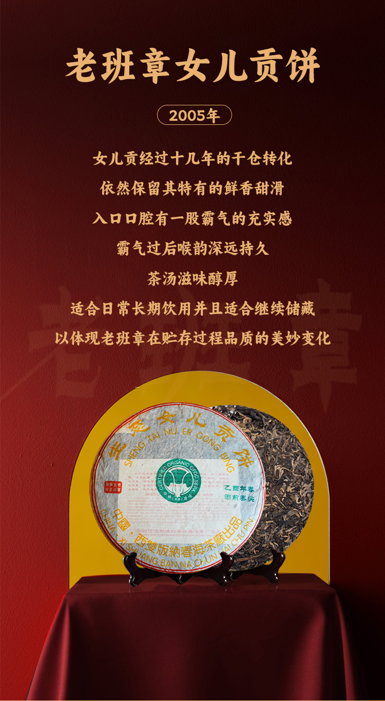女儿贡经过十几年的干仓转化,依然保留其特有的鲜香甜滑,入口口腔有一股霸气的充实感,霸气过后喉韵深远持久。茶汤滋味醇厚,适合日常长期饮用,并且适合继续储藏,以体现老班章普洱茶在贮存过程品质的美妙变化。